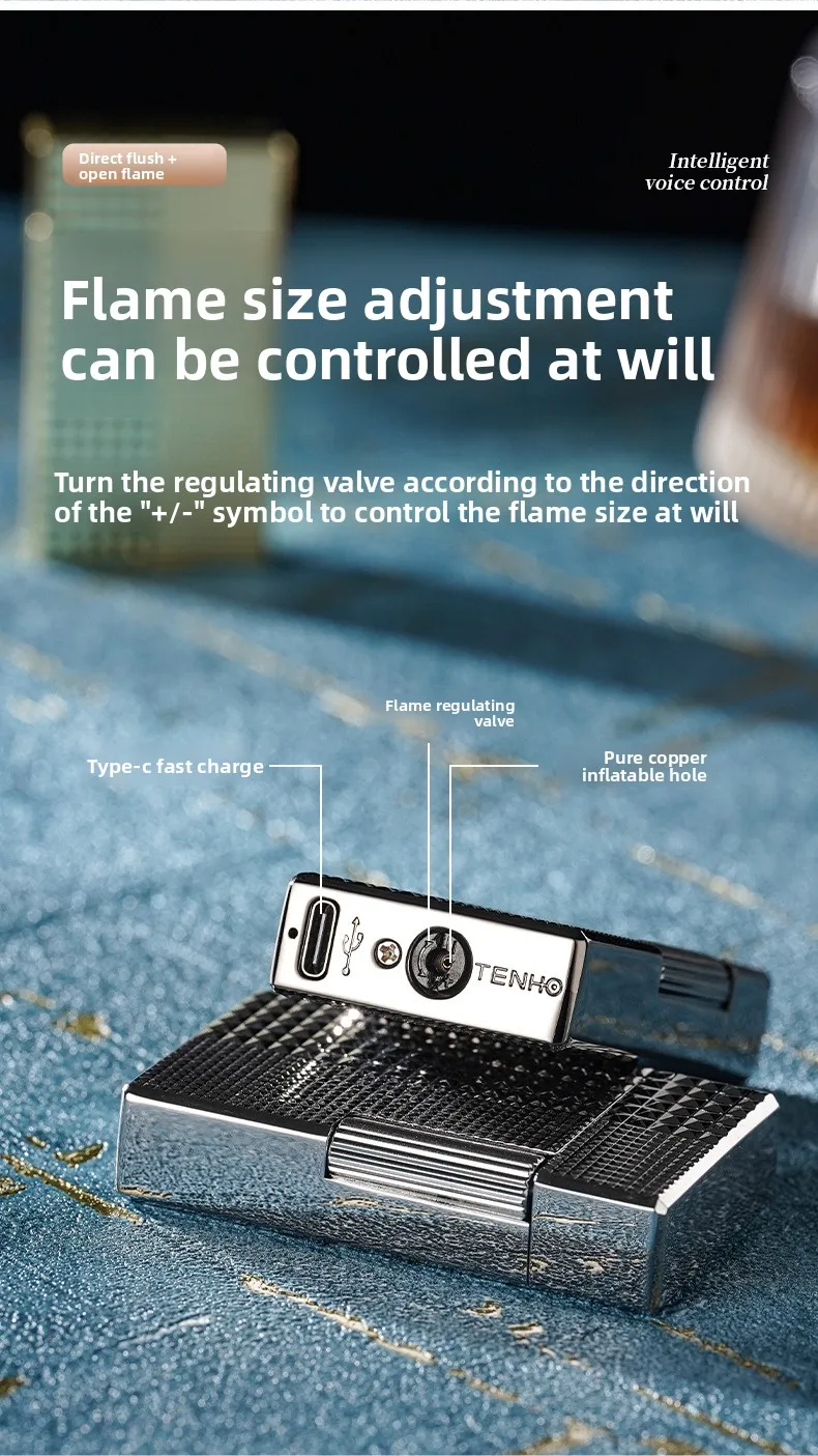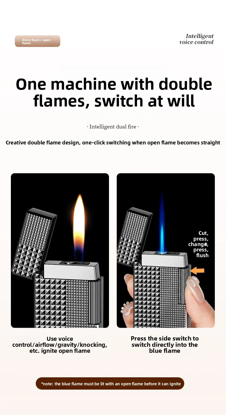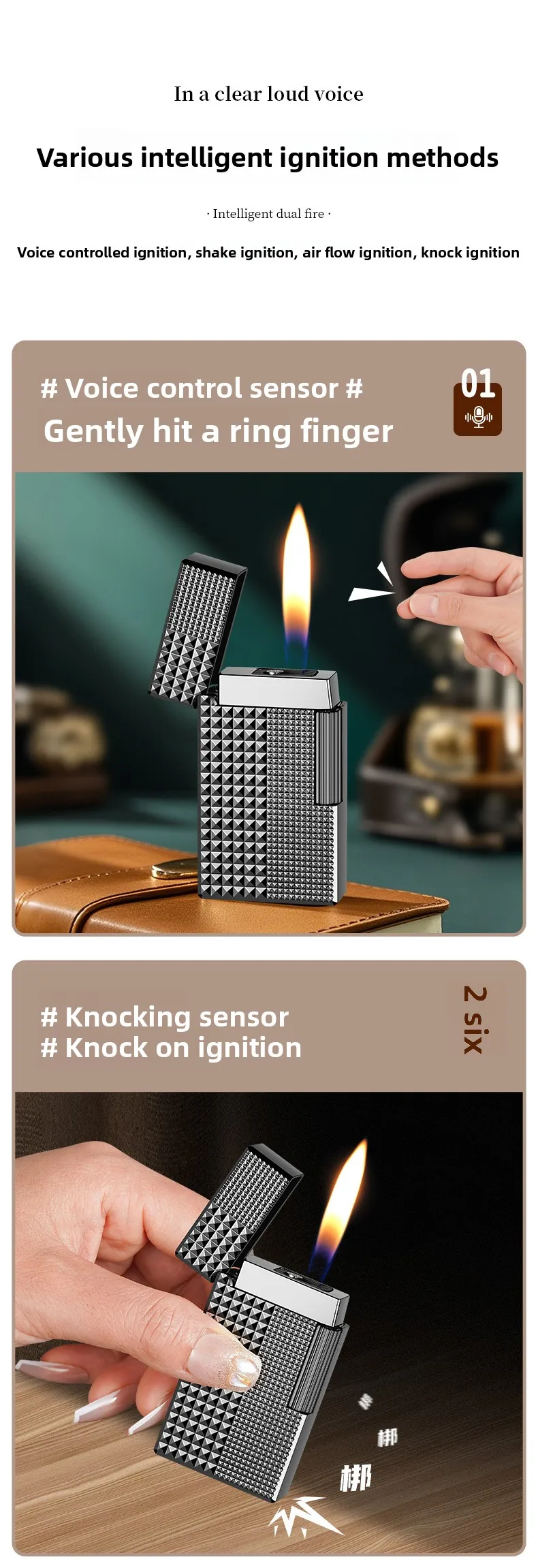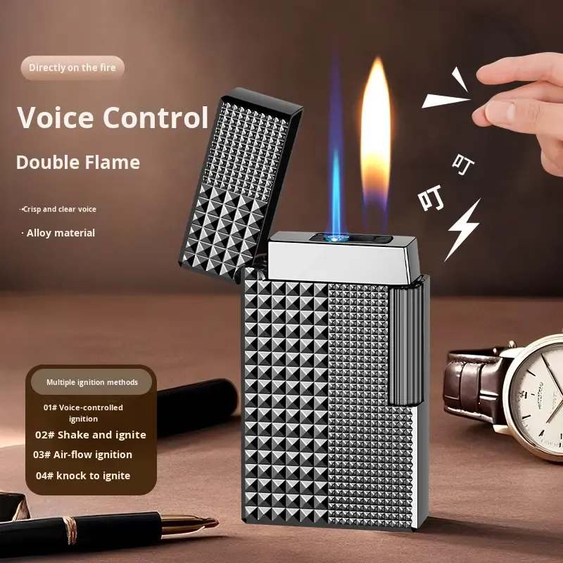 Modern metal dual-flame four-ignition dual-use gas electric hybrid lighter a gift for men featuring induction and voice control.